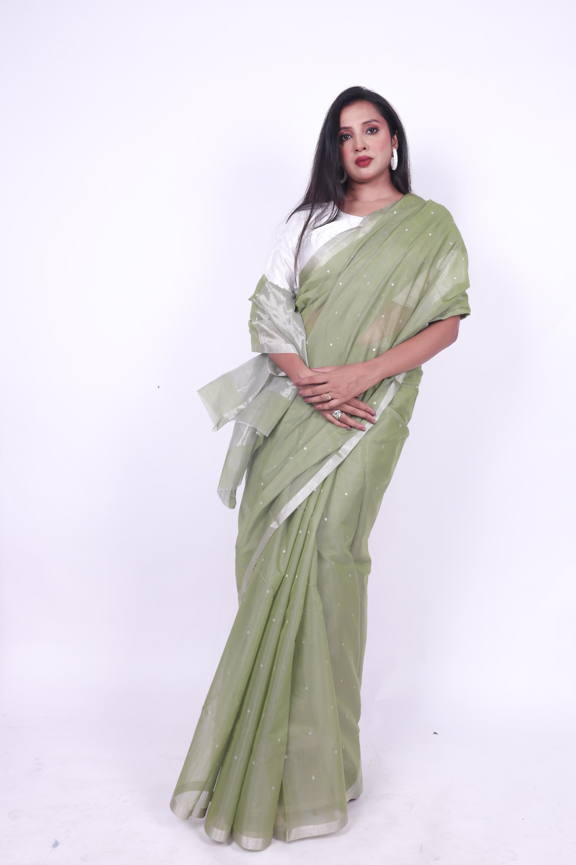 Pista green pure chanderi cotton star butti saree with silver selvage